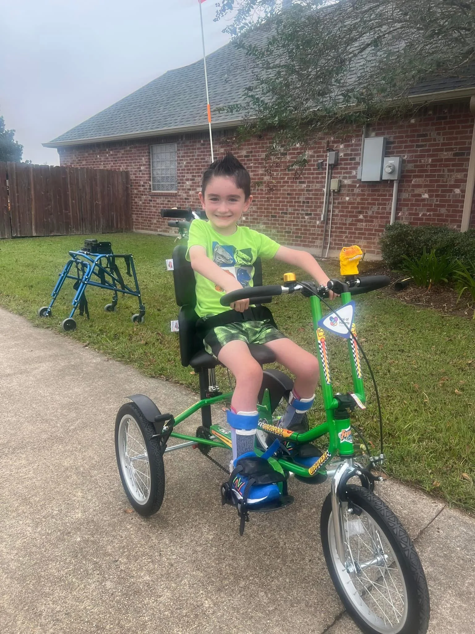 “Almost two years ago when Brantley was gifted this bike, he could barely ride it alone. After time spent outside on it, this bike has given Brantley the strength to pedal alone. He loves being able to go ride with his cousins and feels like a part of the group. It’s given him Independence as well as helping him improve his strength. Within this past week, Brantley was able to take four steps in his arm crutches without any assistance and also stand up alone. I do believe because of him being able to ride his bike is what is helping. We are very thankful for the Ace of Hearts Foundation and what they have done for him!’